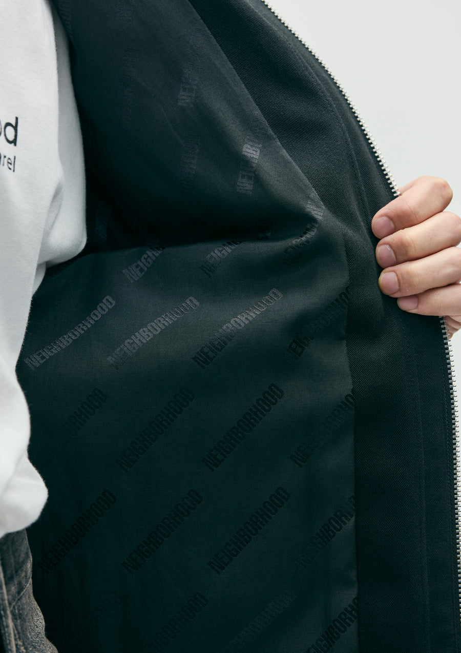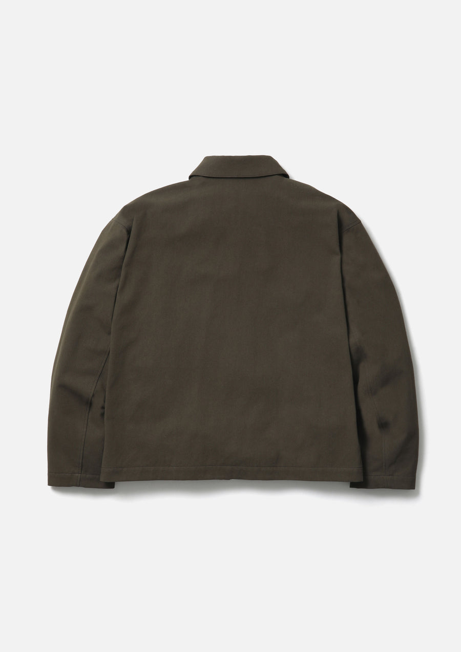 A utility jacket made from chino fabric featuring toughness from strong-twist yarns and a dry-touch texture. The front has a large placket with a zipper closure. Equipped with four utility pockets with tucks. The lining features a jacquard logo. A brand tag on the placket and on the side seam.