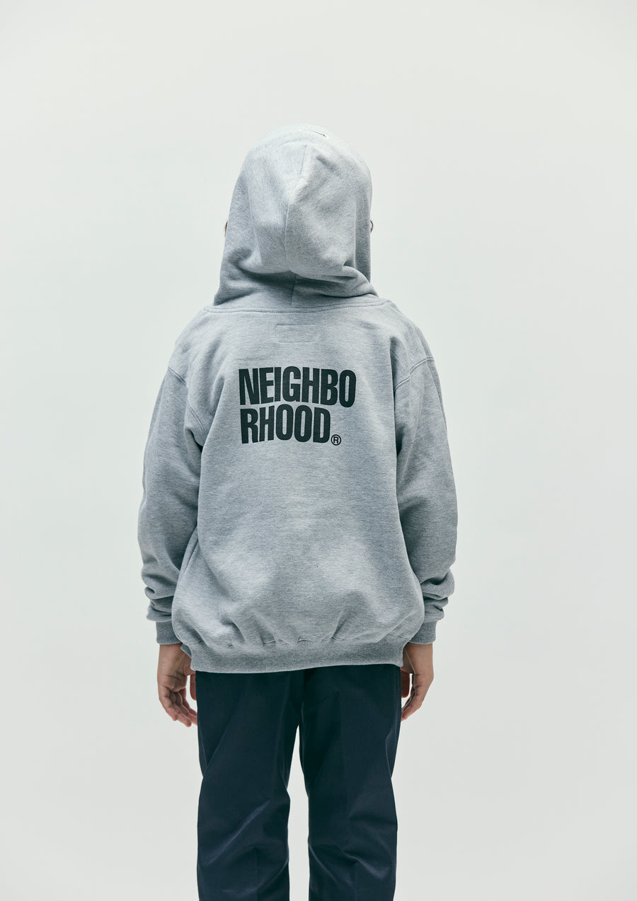 A zip-up hoodie made of mid-weight cotton fleece fabric. Printed logo on the left chest and back. A name tag is placed on the hood.