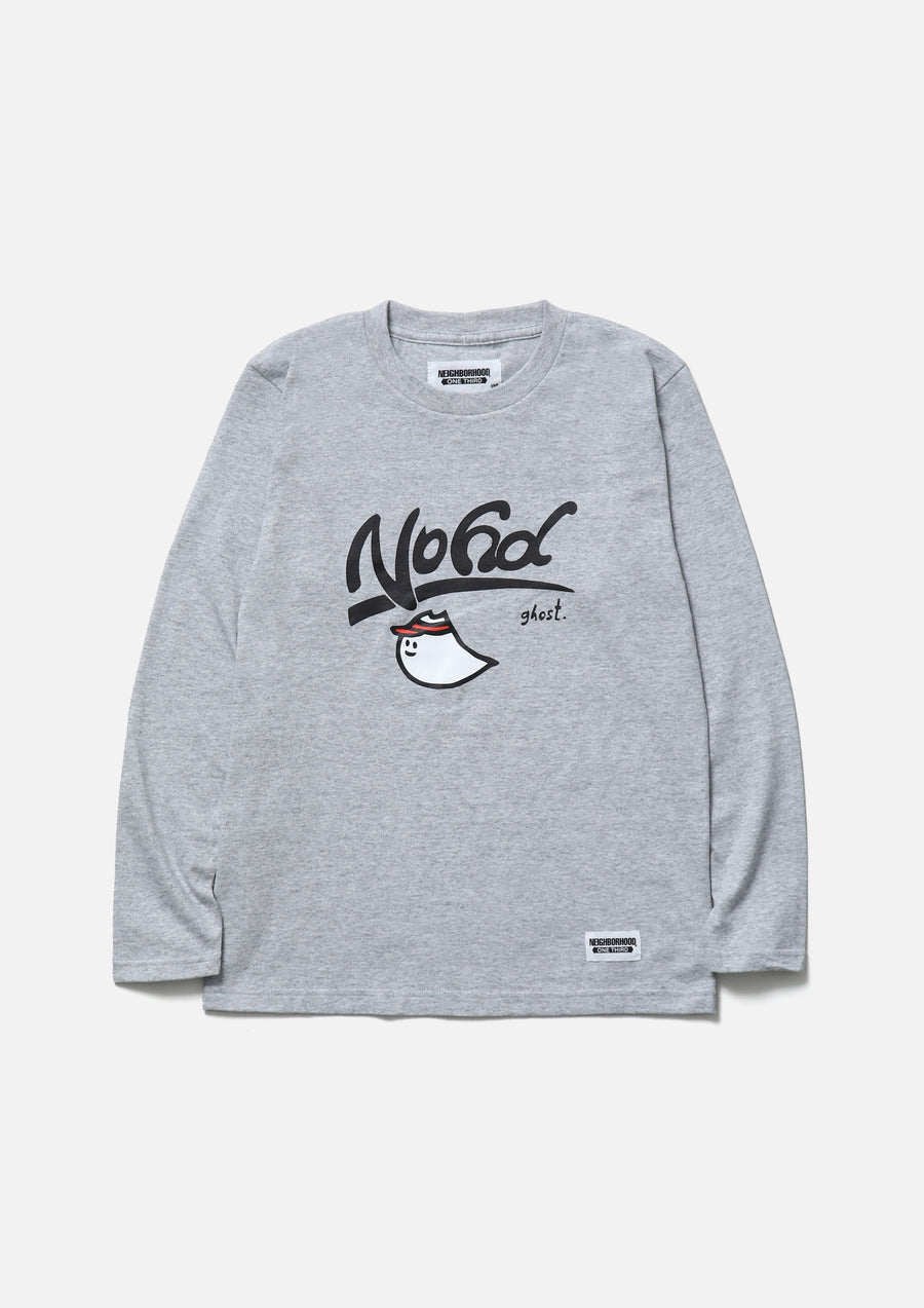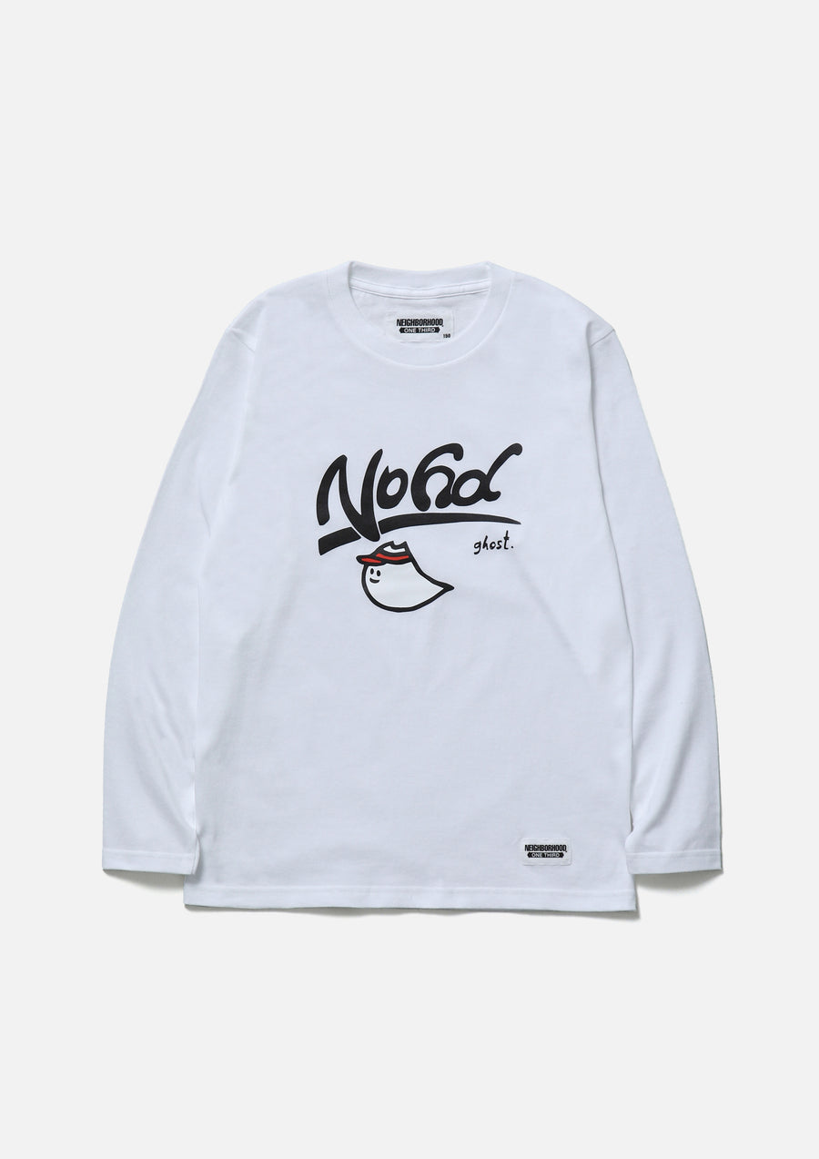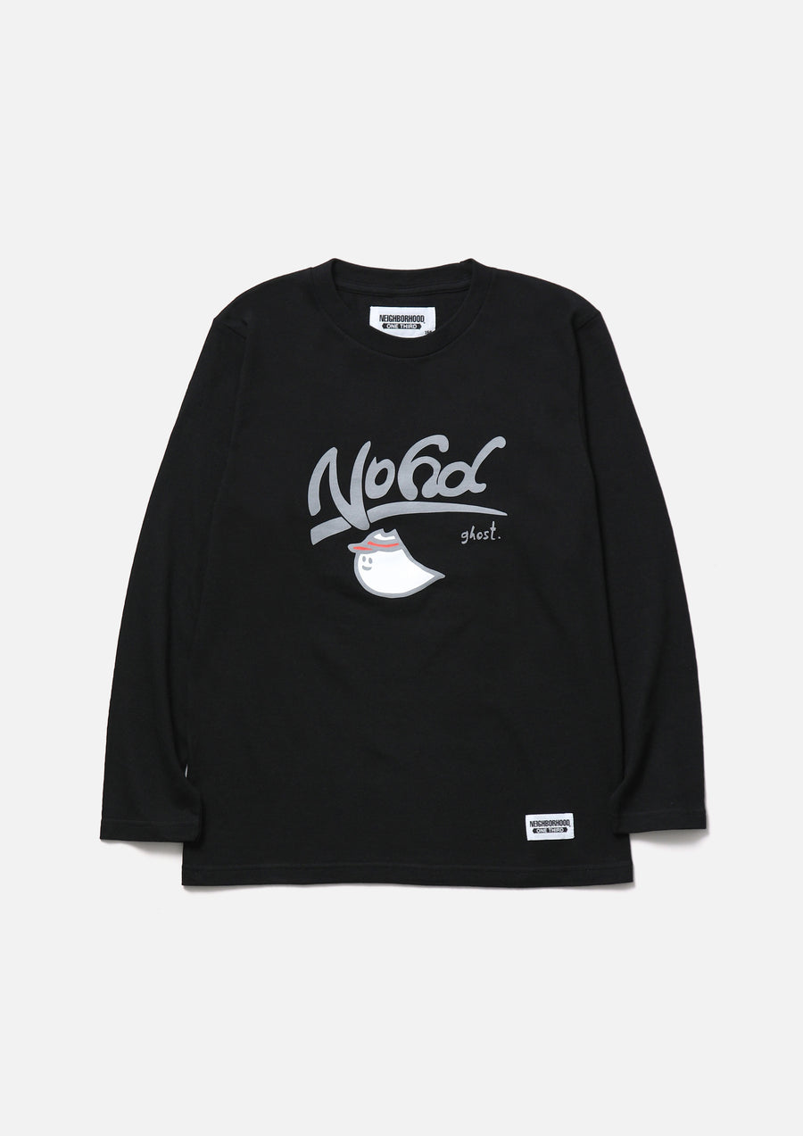 A long-sleeve T-shirt made of a 5.6oz heavyweight body. Features a graphic print by ghost. on the front. A name tag is placed on the left hem.