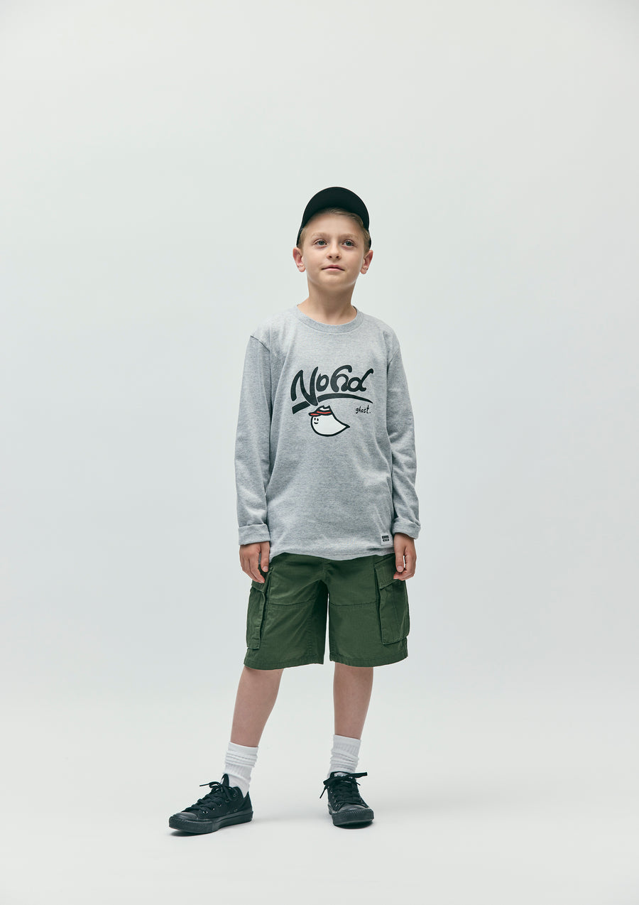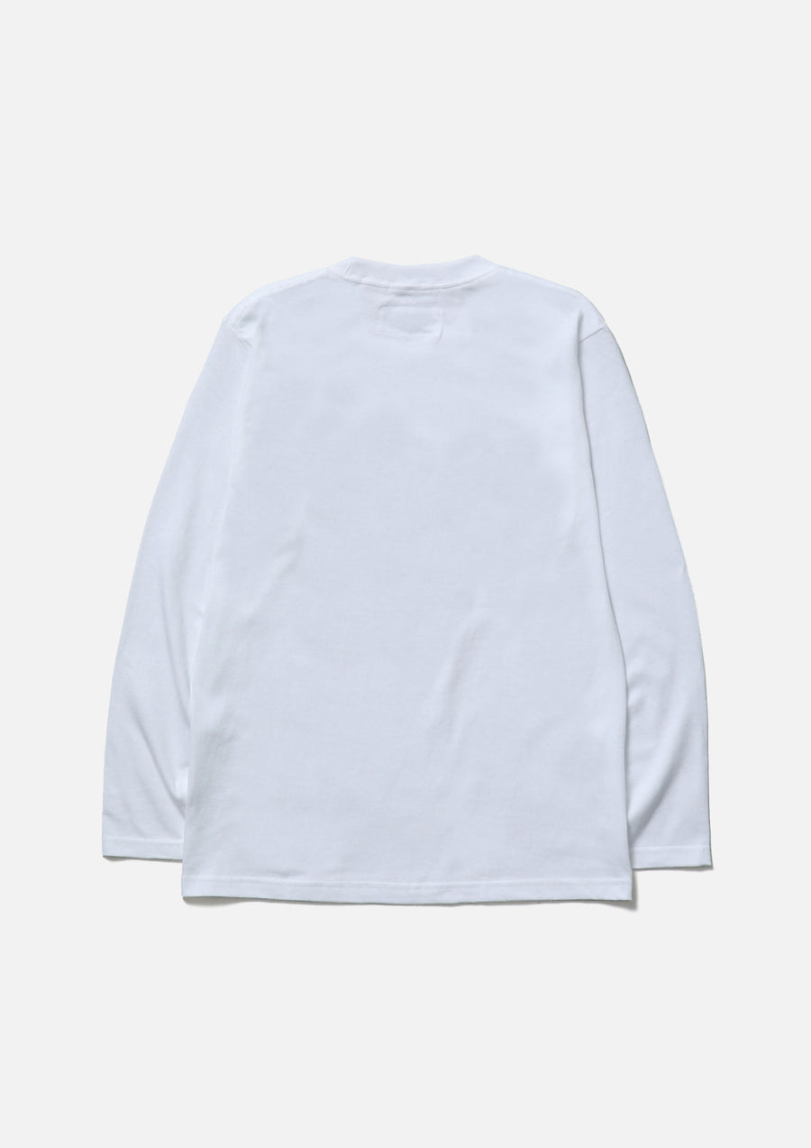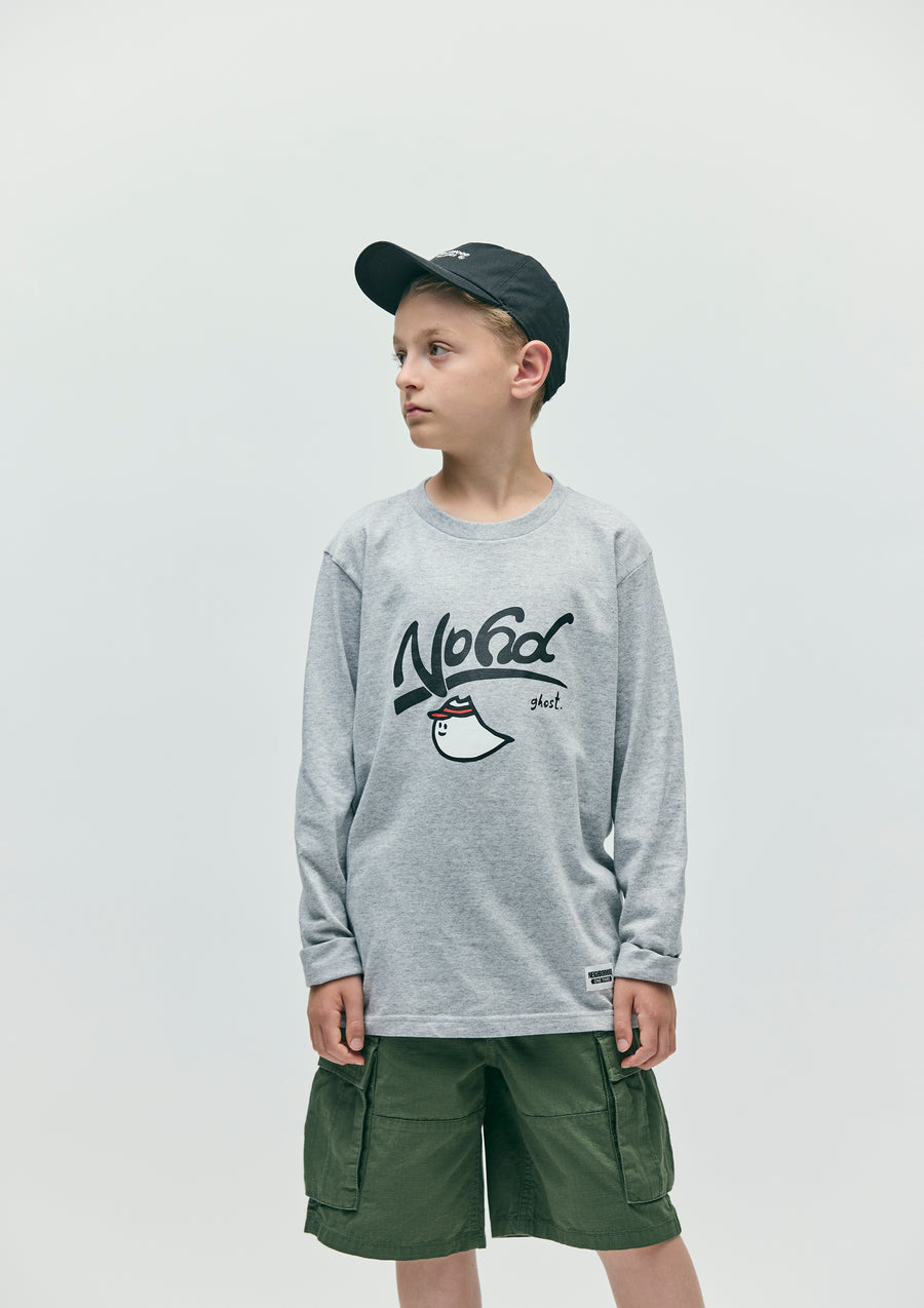 A long-sleeve T-shirt made of a 5.6oz heavyweight body. Features a graphic print by ghost. on the front. A name tag is placed on the left hem.