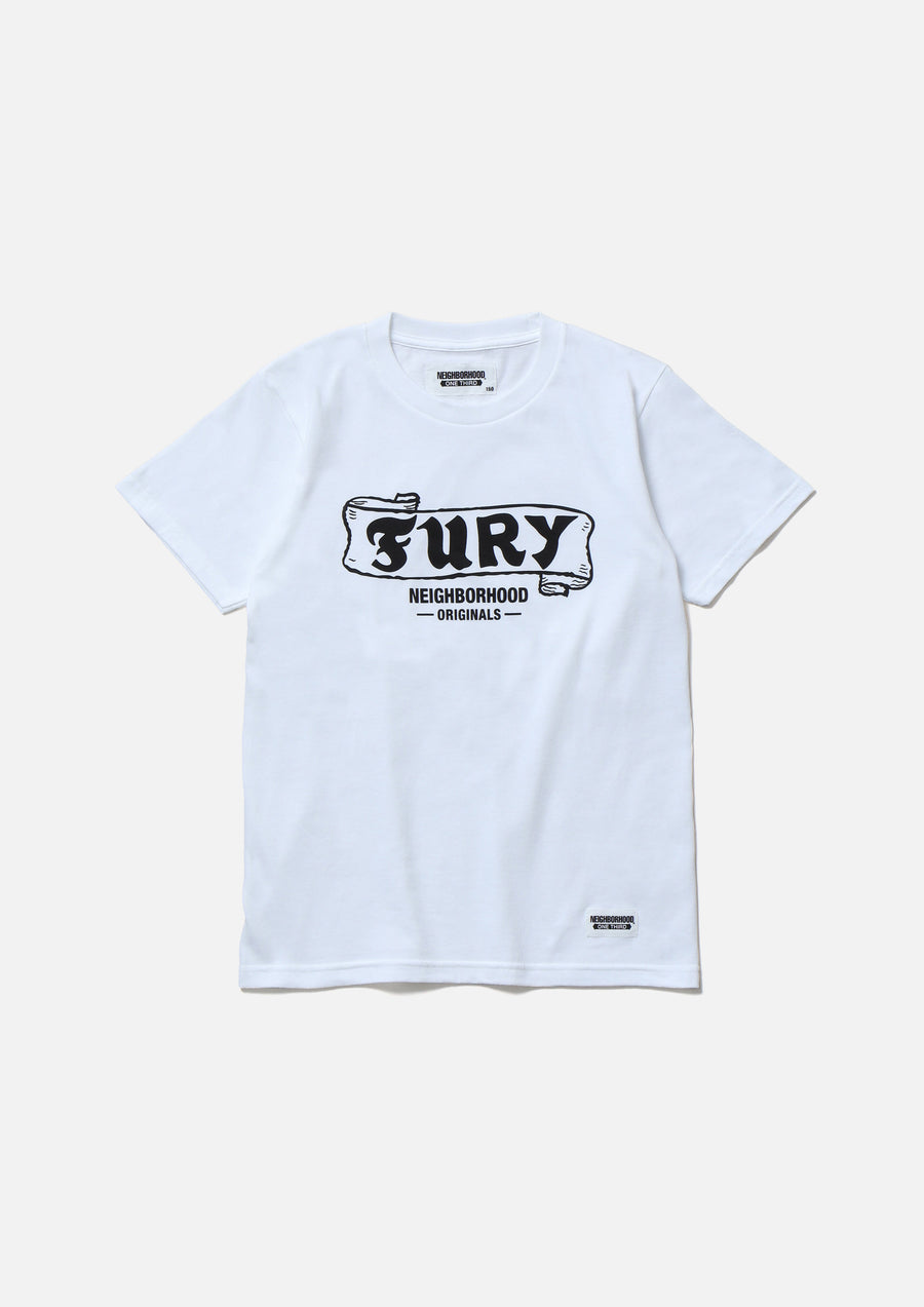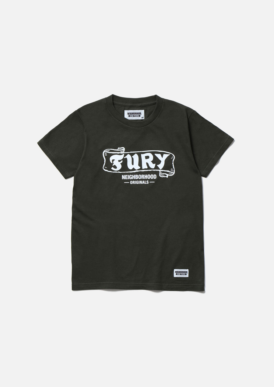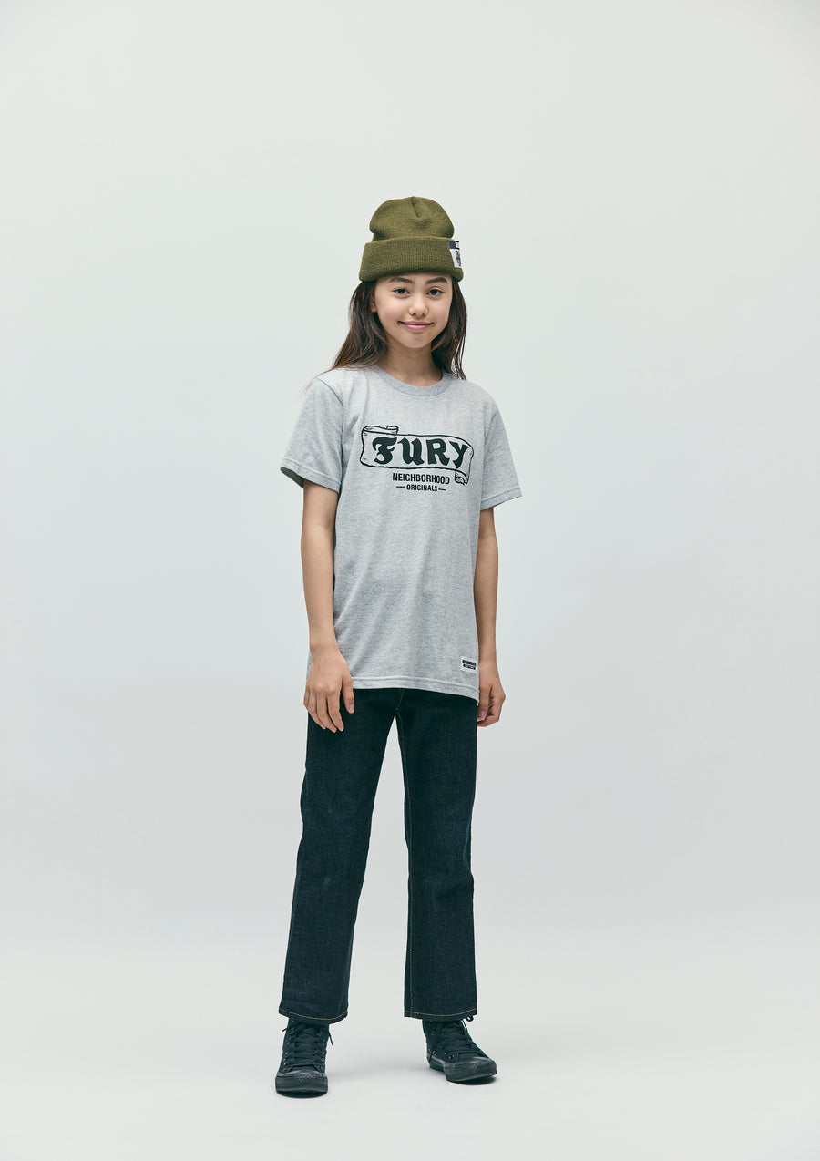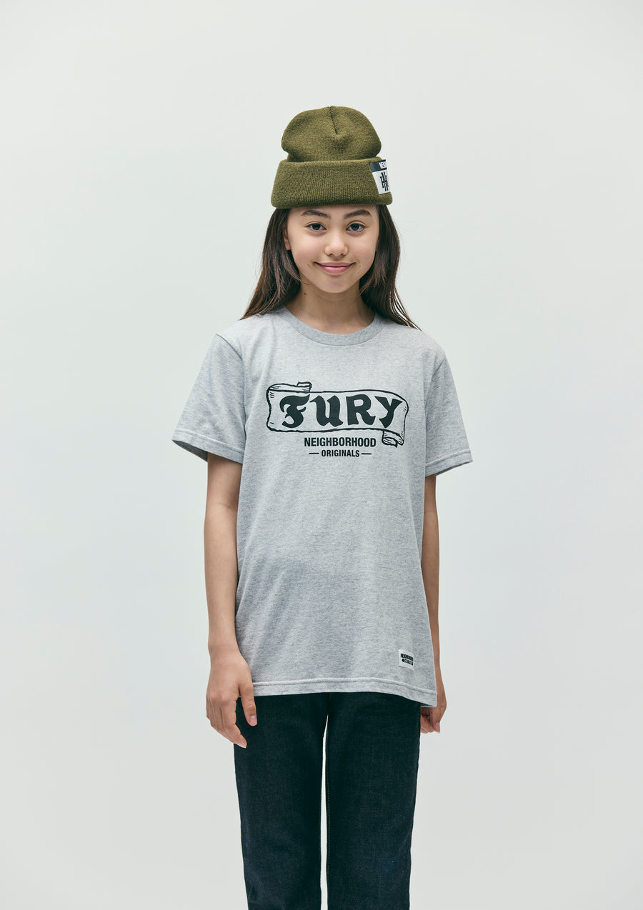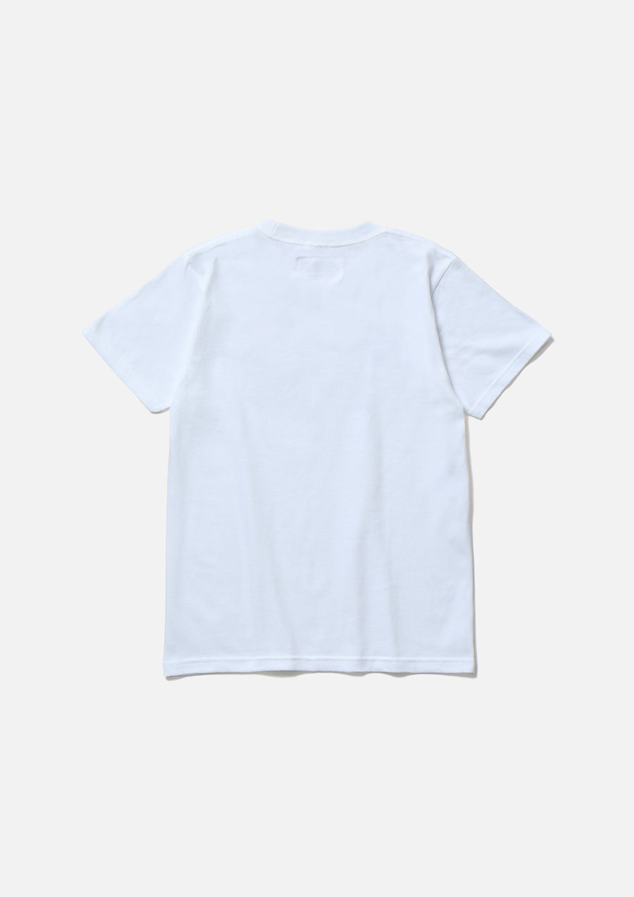A short-sleeve T-shirt made of a 5.6oz heavyweight body. Graphic print on the front. A name tag is placed on the left hem.