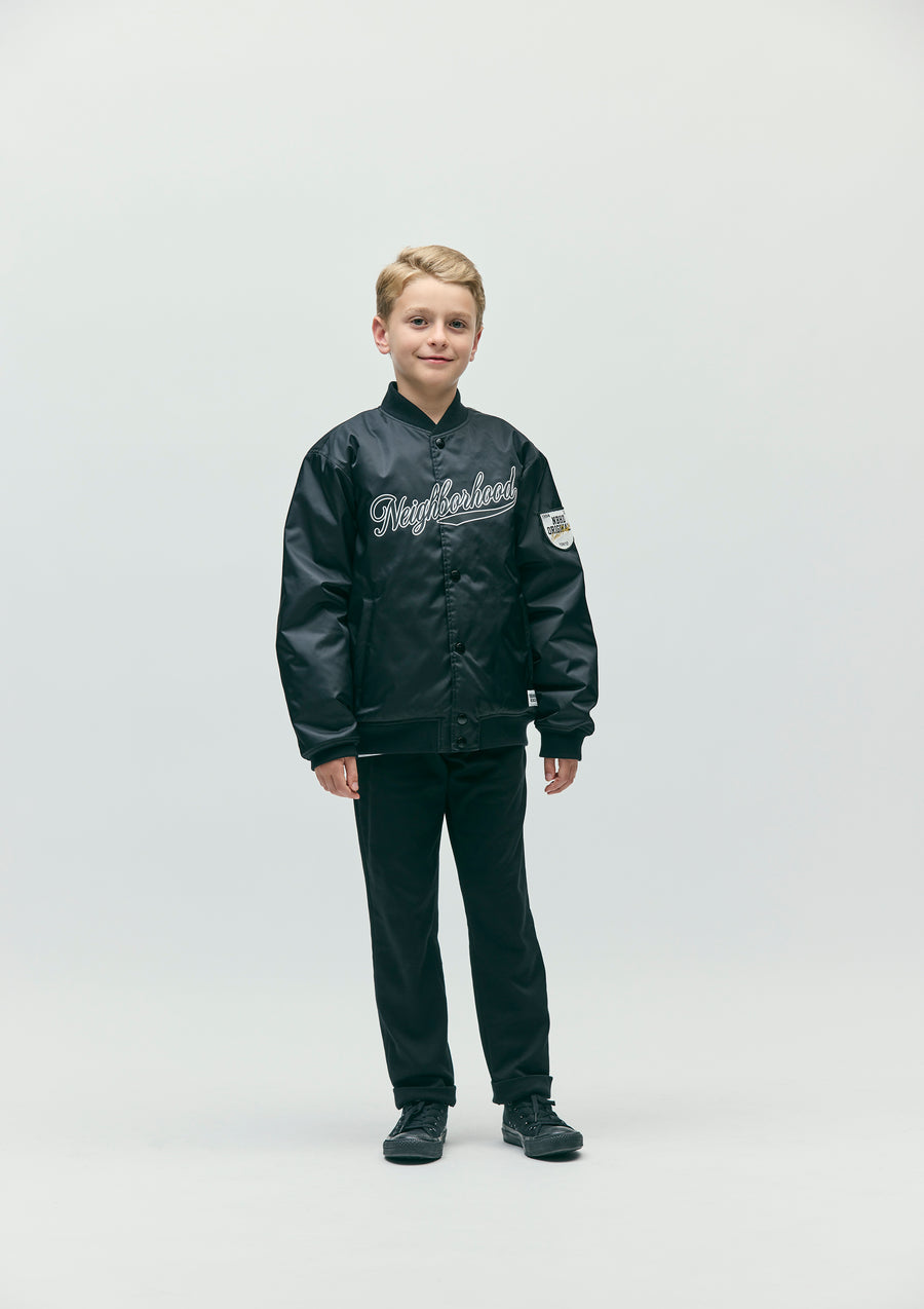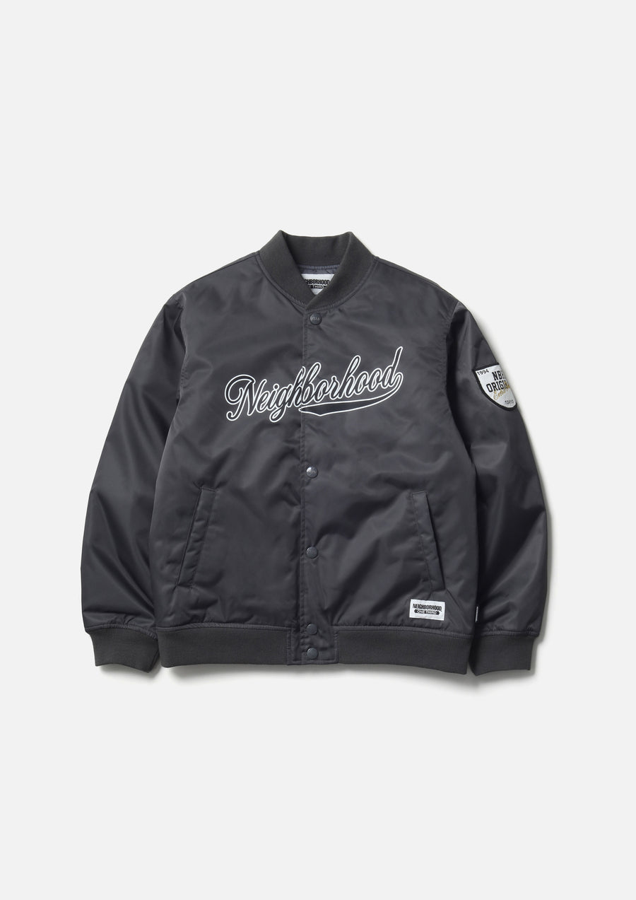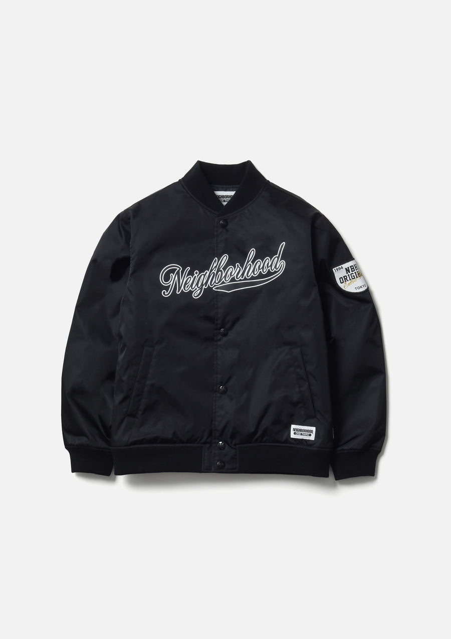 A baseball jacket made from durable nylon twill fabric with a moderate firmness and structure. Features a printed logo on the front and a logo patch on the left sleeve. Equipped with original snap buttons. Includes a brand tag on the left hem and on the side seam.