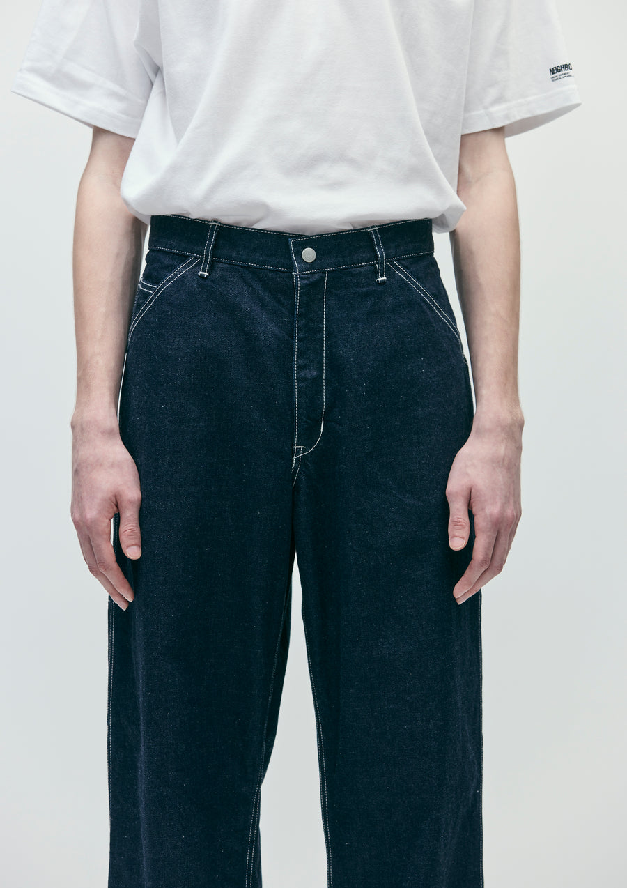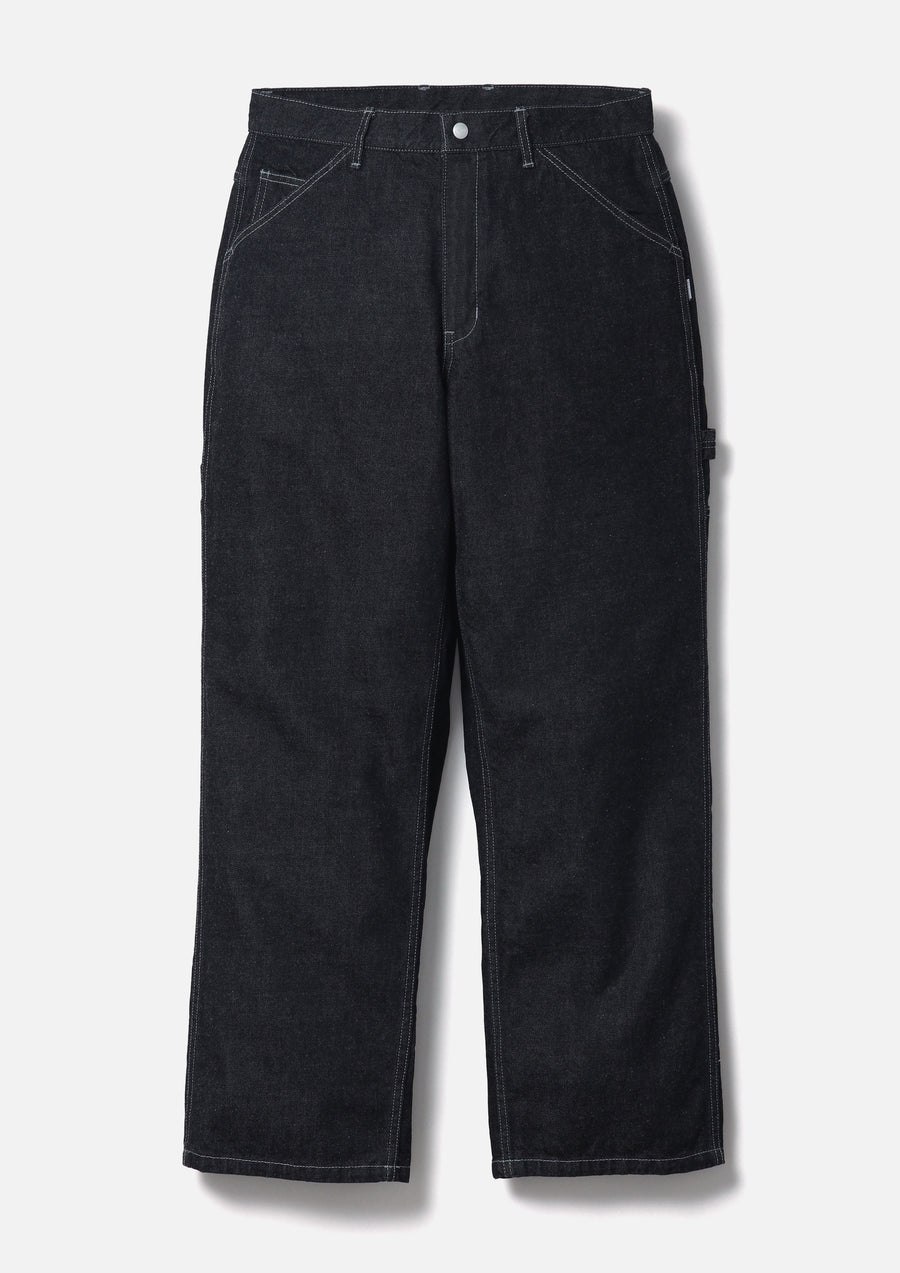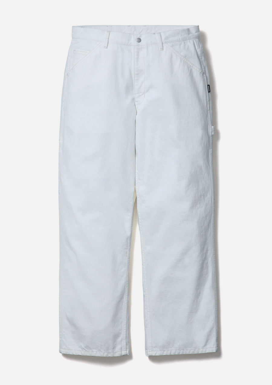 A pair of painter pants made from 12oz denim fabric. The hip pockets feature "N"-shaped design stitching, and the pants include a tool pocket and hammer loop. Equipped with original snap buttons, a front zipper, and pocket lining fabric. Includes a brand tag above the hip pocket and side seam. Relaxed straight silhouette.