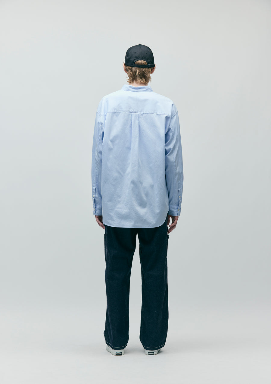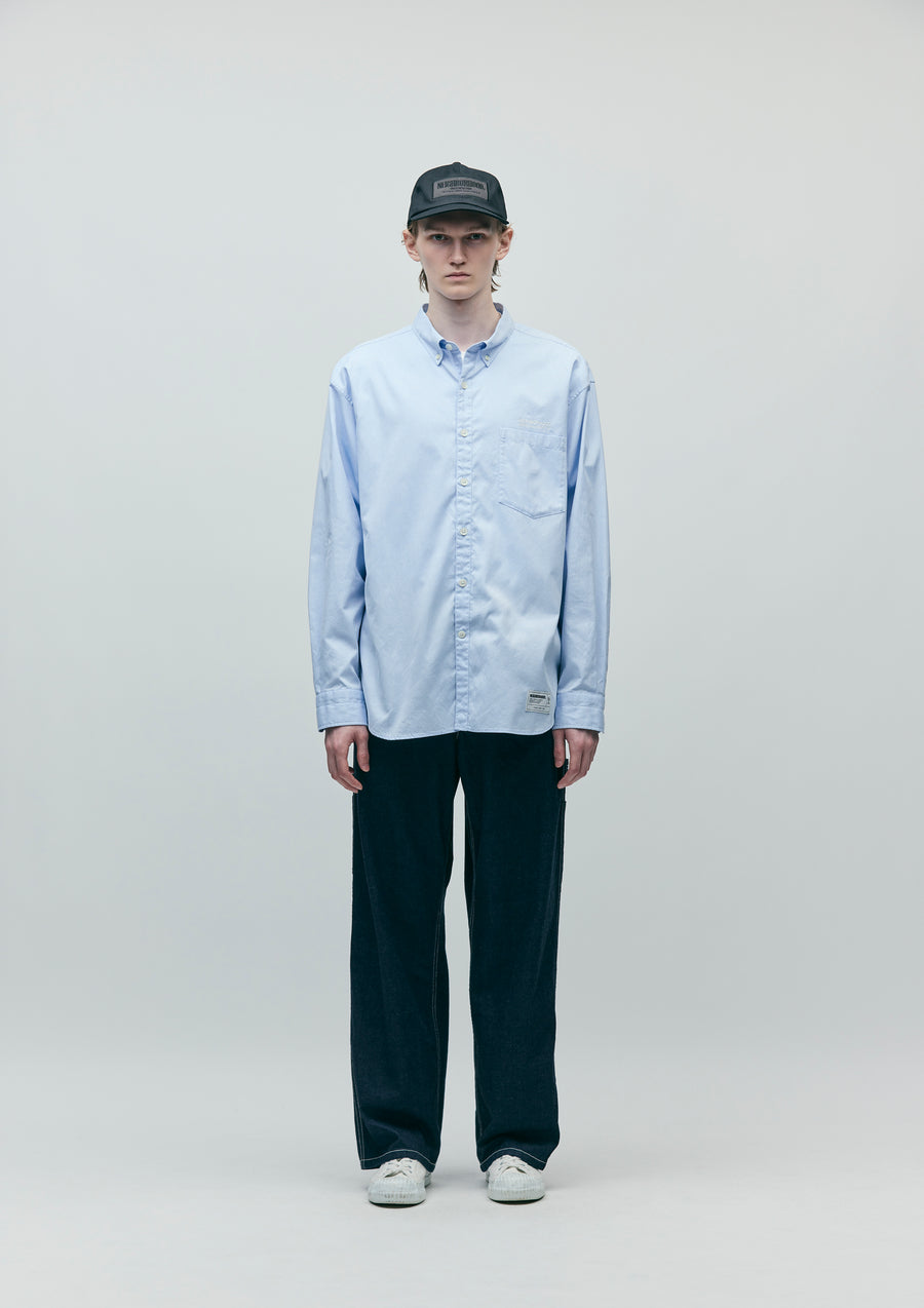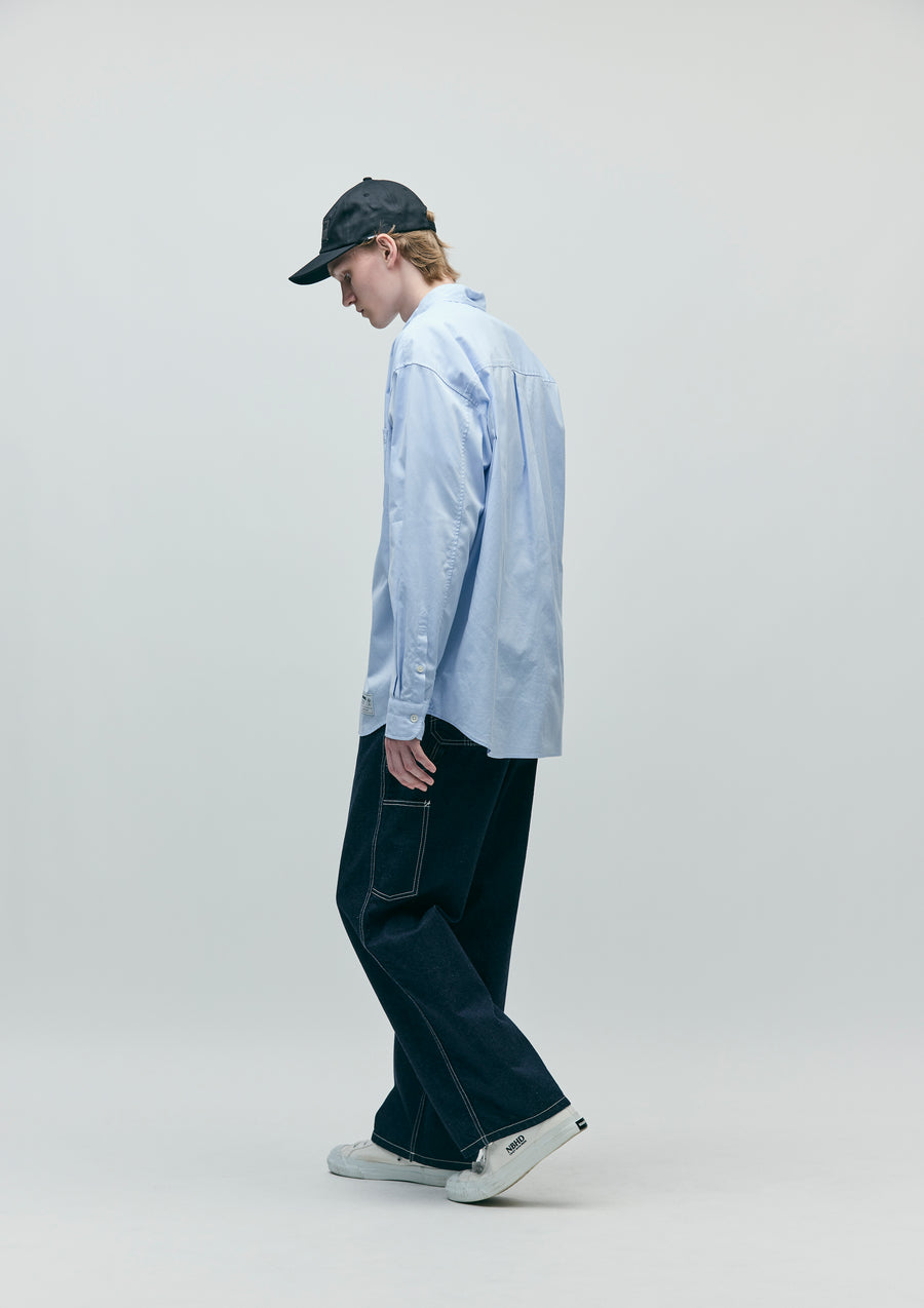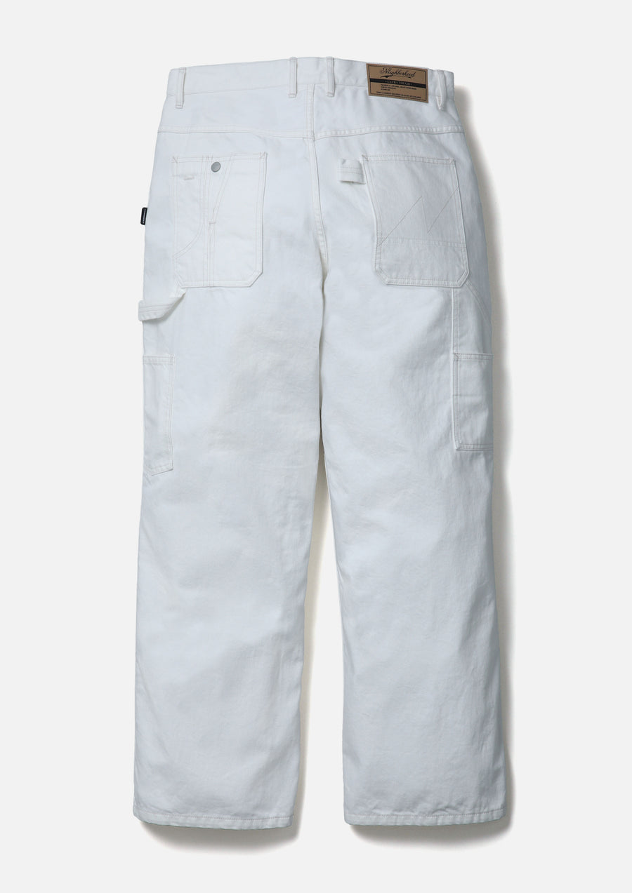 A pair of painter pants made from 12oz denim fabric. The hip pockets feature "N"-shaped design stitching, and the pants include a tool pocket and hammer loop. Equipped with original snap buttons, a front zipper, and pocket lining fabric. Includes a brand tag above the hip pocket and side seam. Relaxed straight silhouette.