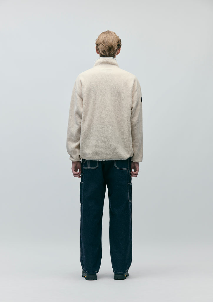 A pair of two-tuck pants made from thick serge fabric with a firm structure. Uses a non-stretch material that resists shape deformation. Features "N"-shaped design stitching on the hip pockets. Equipped with original tack buttons, a front zipper, and signature tape. Includes a brand tag on the back of the waistband and side seam. Relaxed silhouette.
