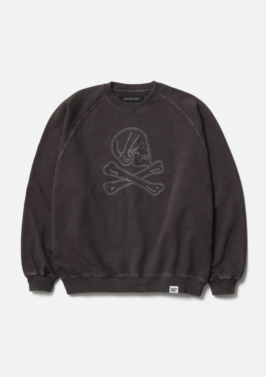 A crewneck pullover made from loopback fabric, pigment-dyed in its finished state. Designed with raglan sleeves, it features bonded stitch embroidery of a skull motif on the front. A brand tag is attached to the side seam.