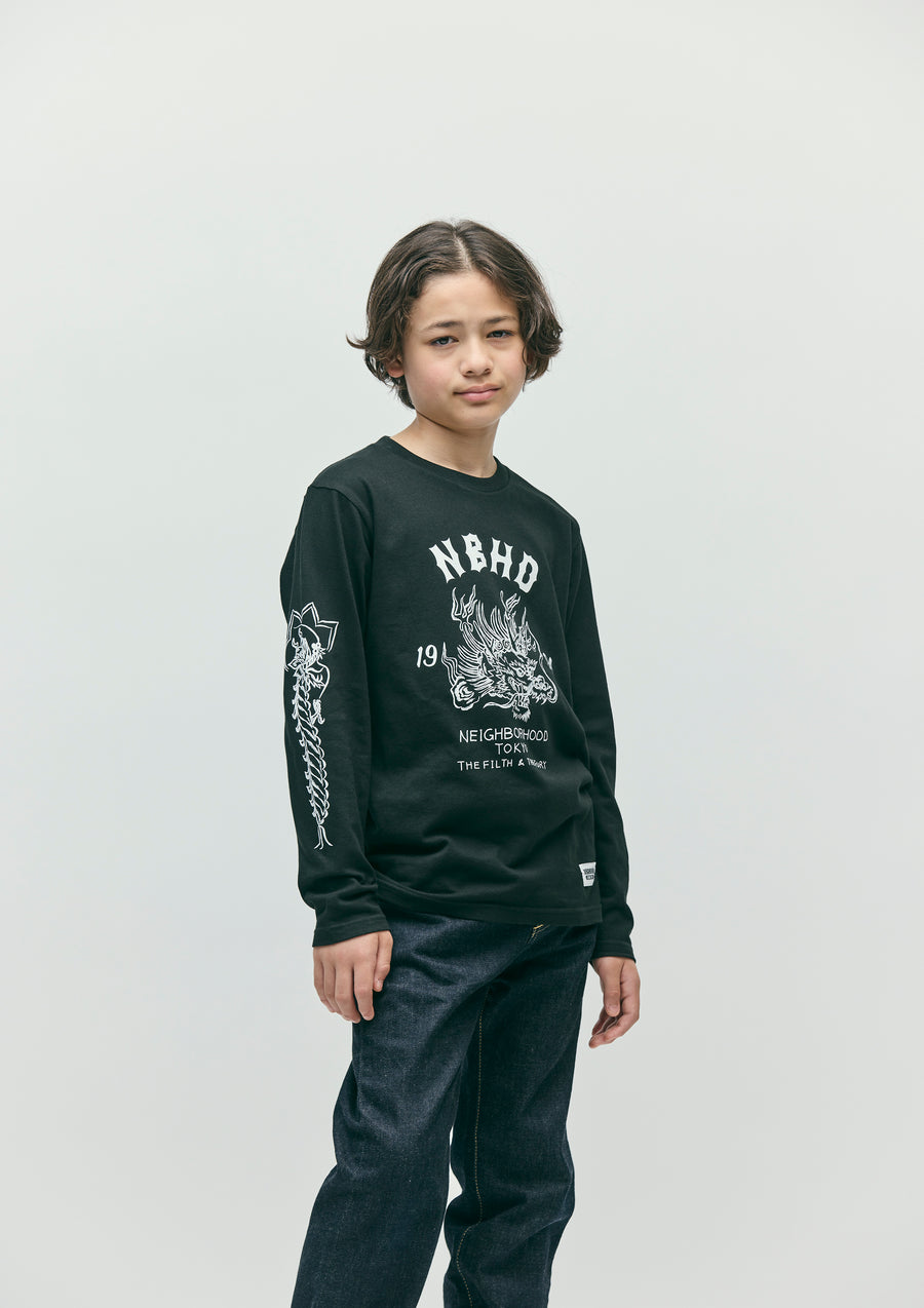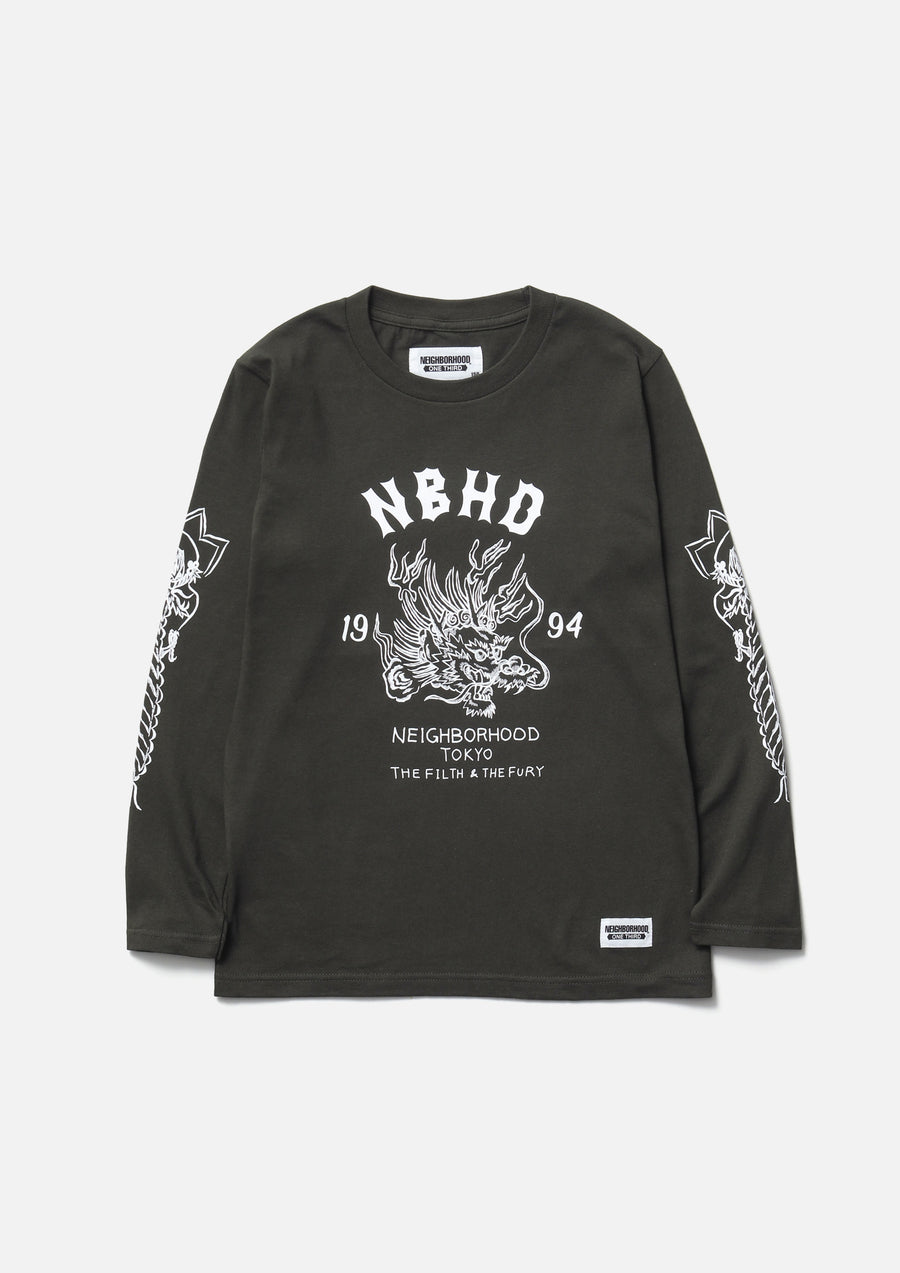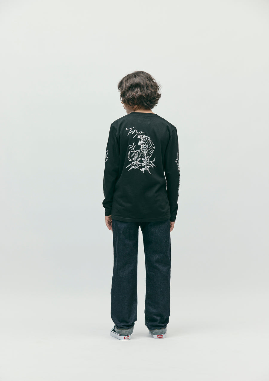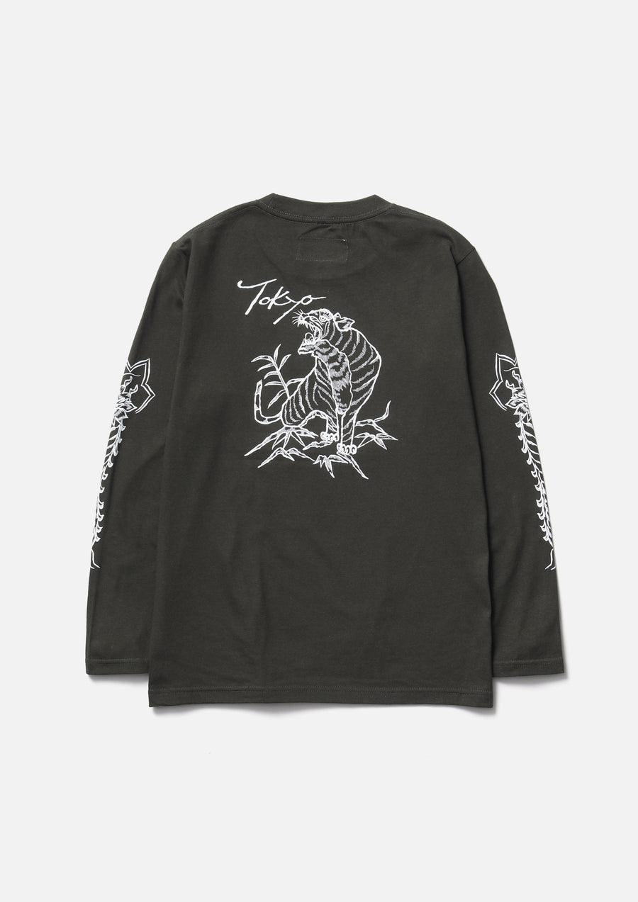 A long-sleeve T-shirt made of a 5.6oz heavyweight body. Graphic prints on the front, back, and sleeves. A name tag is placed on the left hem.