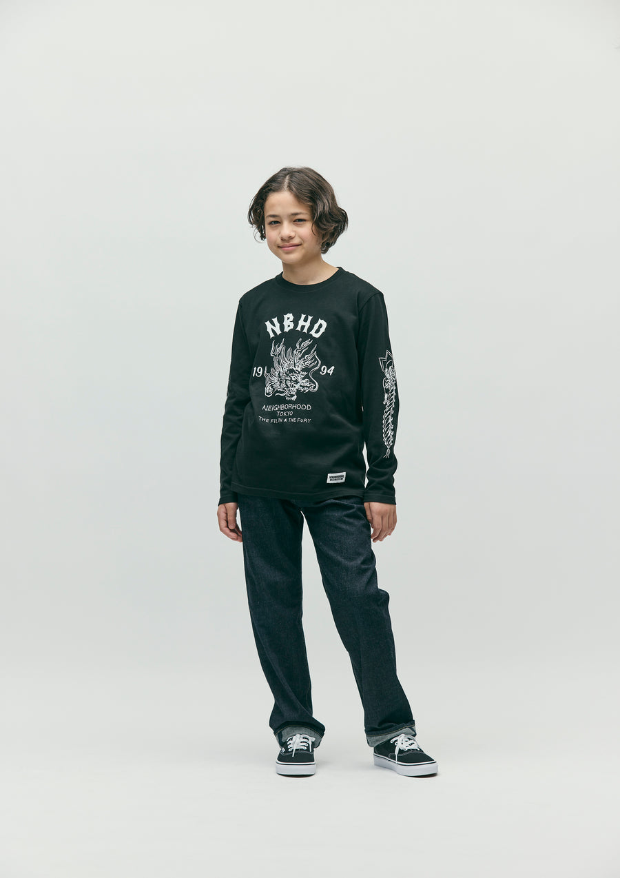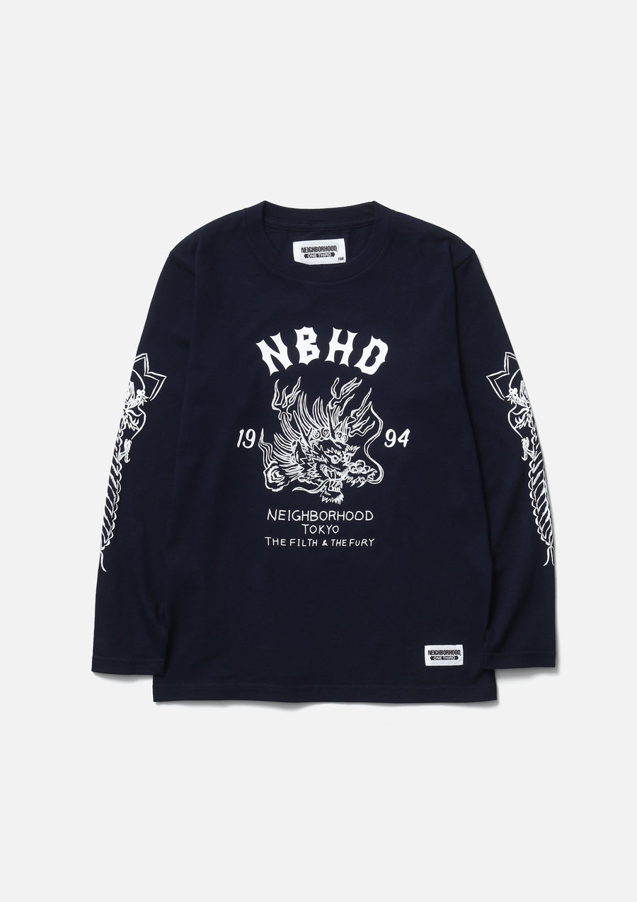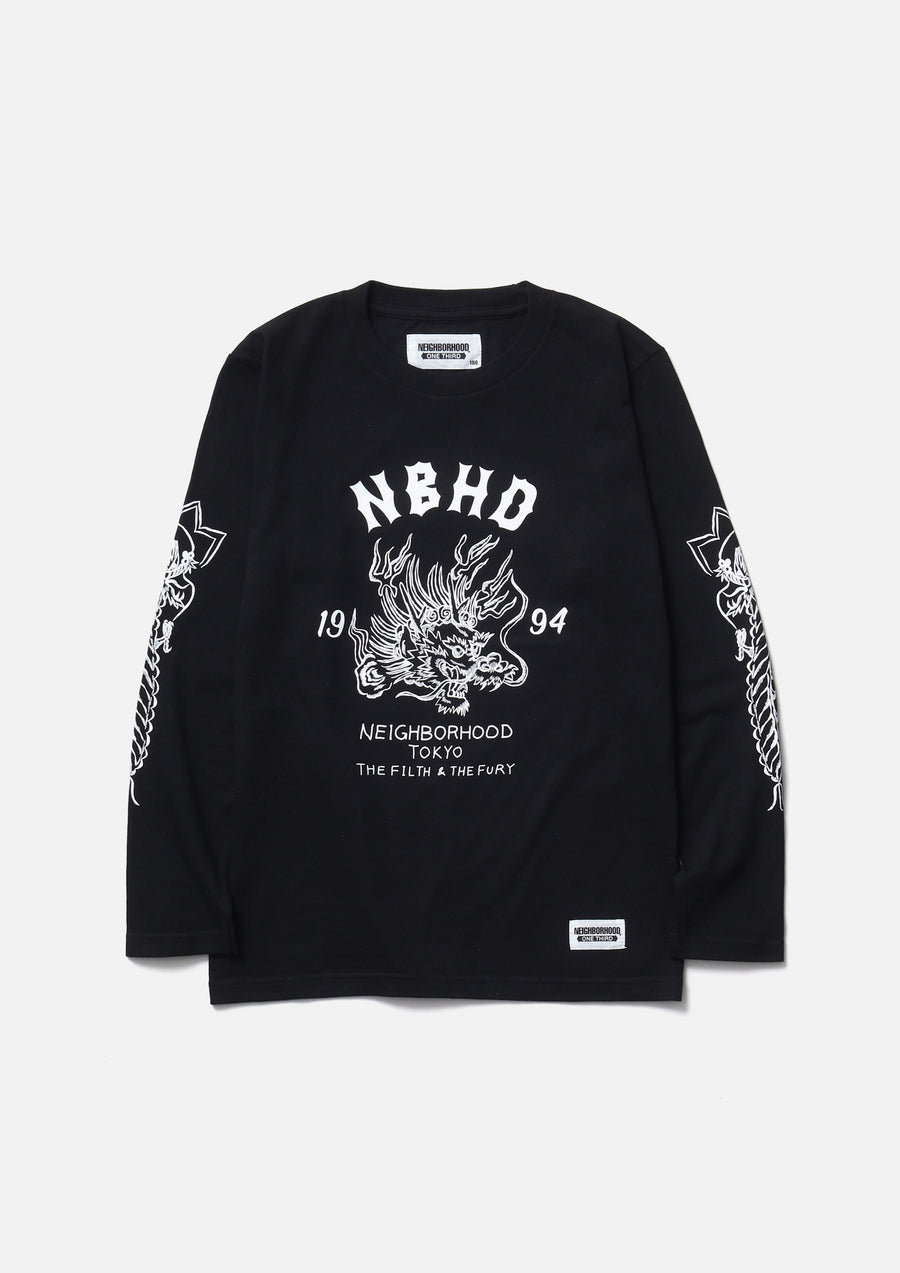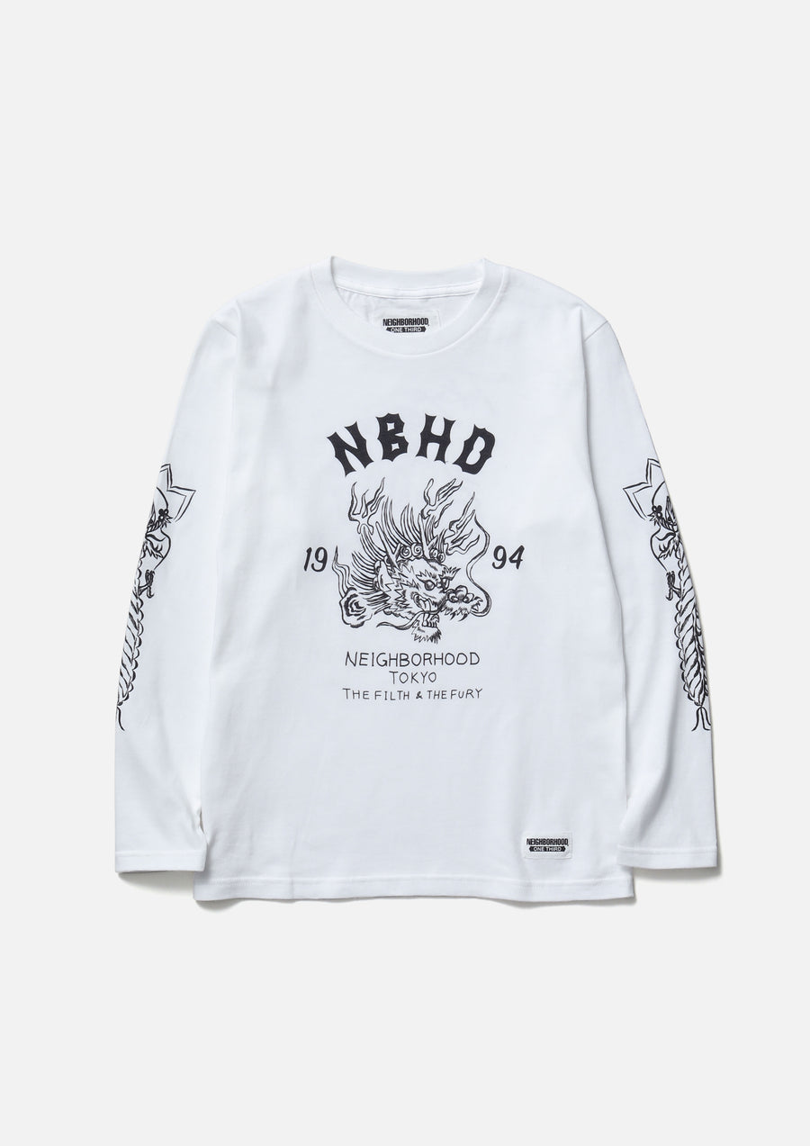 A long-sleeve T-shirt made of a 5.6oz heavyweight body. Graphic prints on the front, back, and sleeves. A name tag is placed on the left hem.