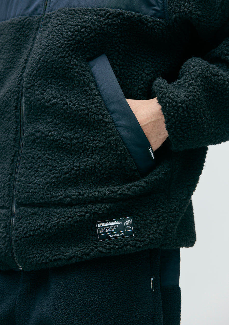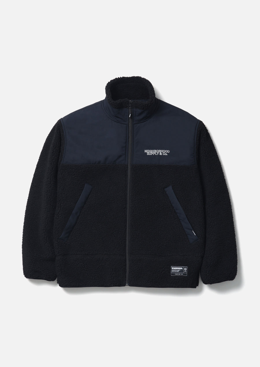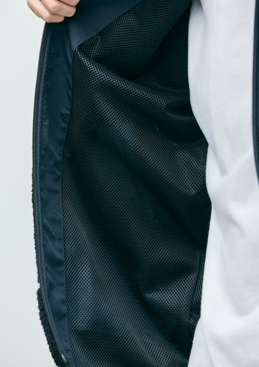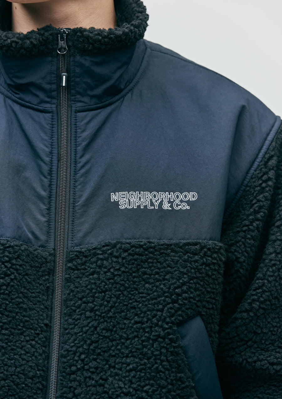A fleece jacket made with voluminous boa fleece fabric combined with dry-touch nylon taffeta. Embroidered logo on the left chest and back. The lining features polyester mesh fabric. A brand tag on the left hem and near the pocket opening.
