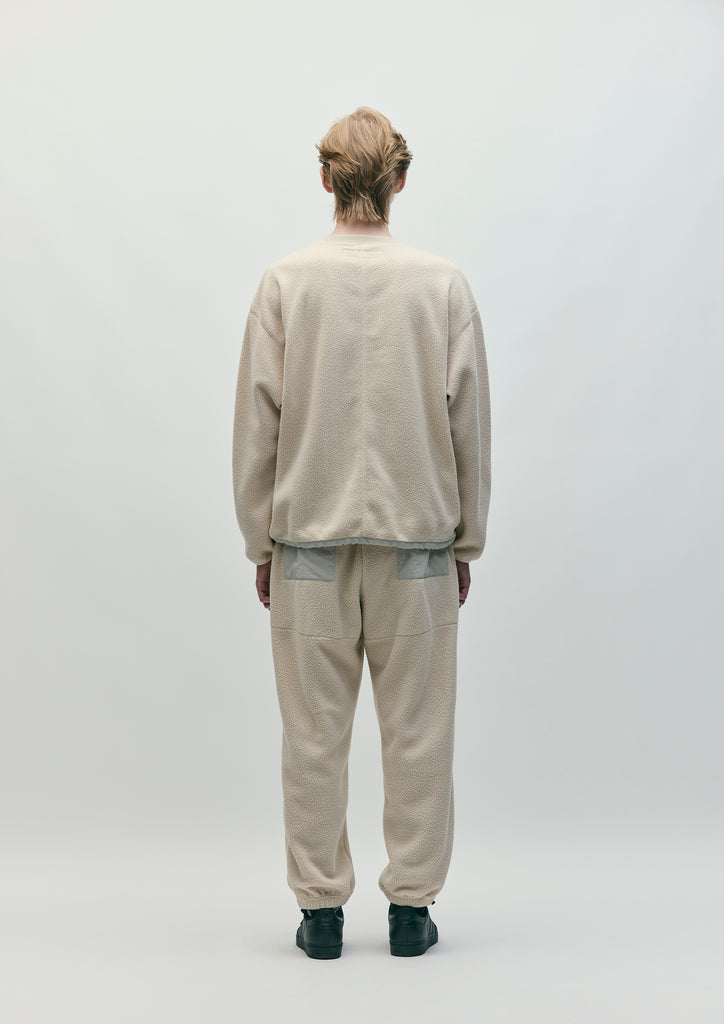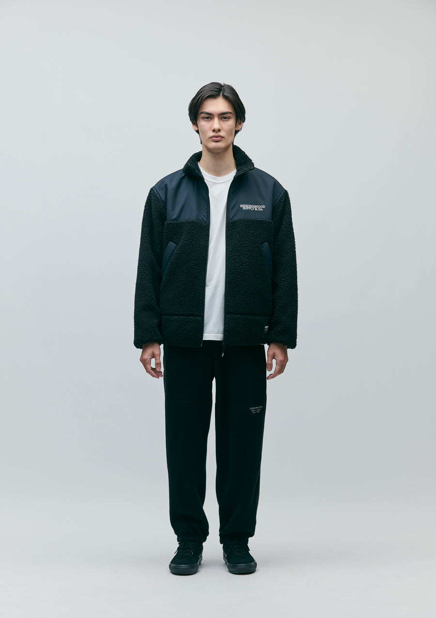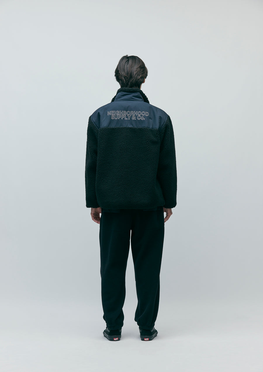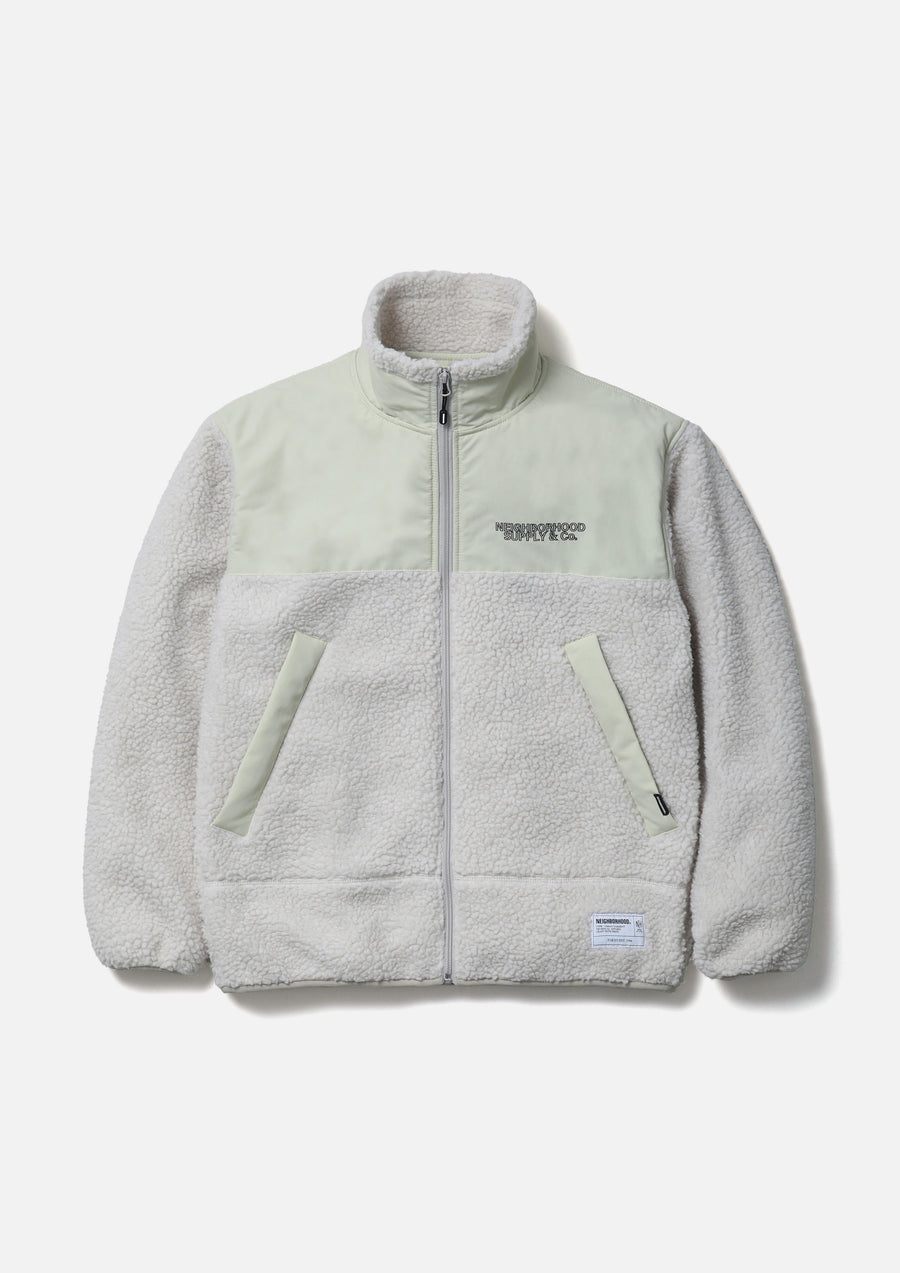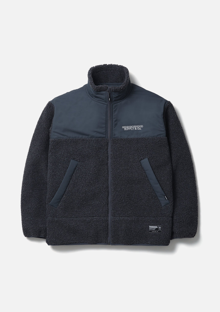 A fleece jacket made with voluminous boa fleece fabric combined with dry-touch nylon taffeta. Embroidered logo on the left chest and back. The lining features polyester mesh fabric. A brand tag on the left hem and near the pocket opening.
