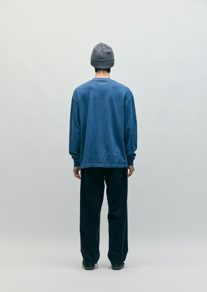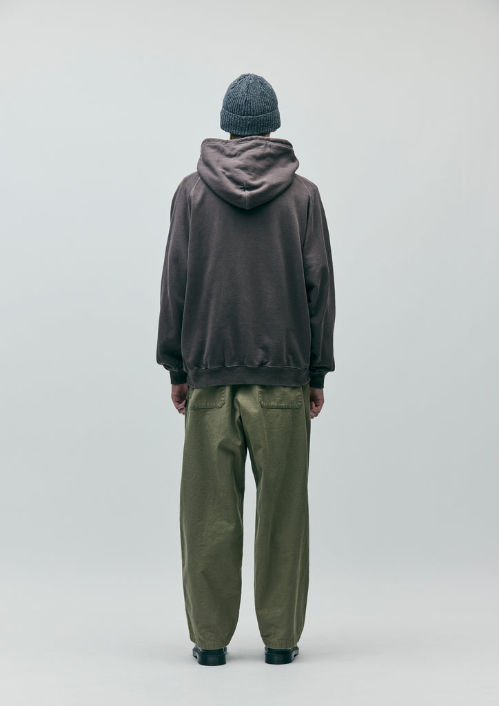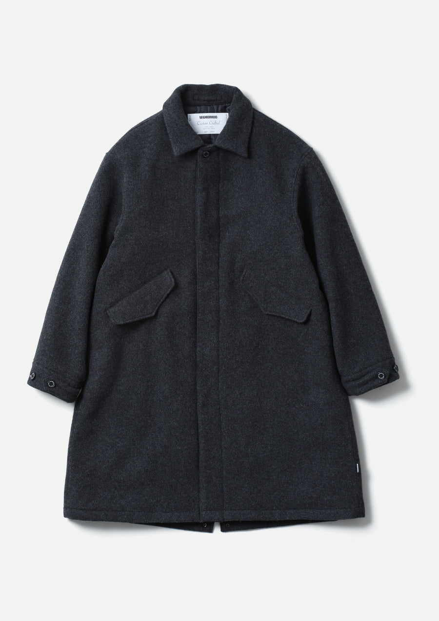 A wool coat made from mid-weight top melton fabric, featuring a soft texture with a double-weave finish using top-dyed yarn. Equipped with concealed snap-button flap pockets on both sides. The hem is designed in a fishtail style. The underside of the sleeves features an original pub towel detail, and the back is printed with a logo. Original four-hole buttons are used, and a brand tag is attached to the side seam.